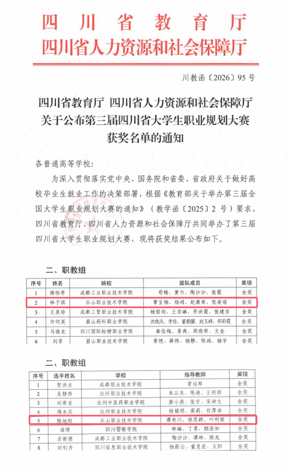 近日,四川省教育厅、四川省人力资源和社会保障厅联合发布《关于公布第三届四川省大学生职业规划大赛获奖名单的通知》,喜讯传来!申搏官网师生在本次省级重磅赛事中表现优异,林子琪老师团队斩获职教组教师赛道金奖,陈旭阳同学荣获职教组成长赛道金奖,一举拿下双项最高荣誉,实现申搏官网在该项赛事上的历史性重大突破,充分彰显申搏官网职业规划教育的深厚底蕴与扎实成效!