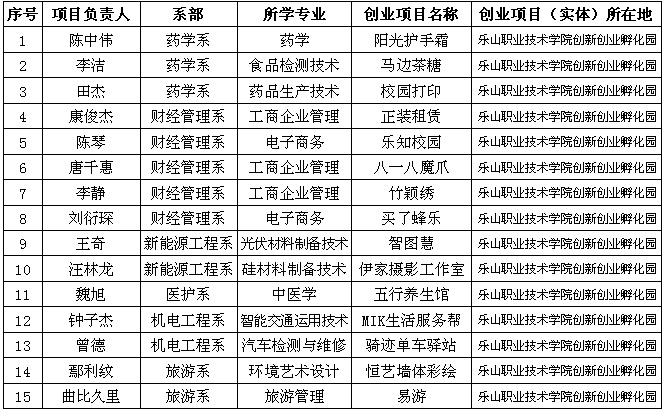 据四川省《关于贯彻落实省政府办公厅加大力度促进高校毕业生就业创业意见有关问题的通知》(川人社发〔2019〕20号)和《关于调整高校创新创业平台内创业补贴审核发放工作的通知》(川人社办发〔2019〕139号)文件要求,经学生自主申报、系(部)初审,由人社局相关部门、学院大学生创新创业活动中心及创新创业指导专家通过现场答辩、实地调查综合评审,现有15个创业项目初审合格,现拟推荐我院创新创业孵化园内的创业项目共计15项申报2019年(上))在校大学生创业补贴,现公示如下: