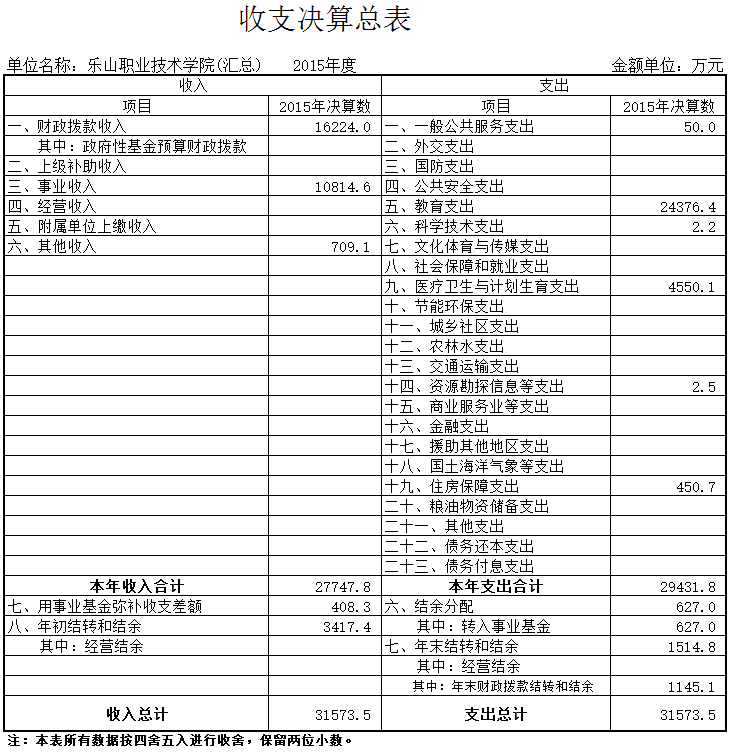 2015年sunbet申搏官方网站收入决算总额为31573.5万元,其中:当年财政拨款收入16224万元,事业收入10814.6万元,其他收入709.1万元,用事业基金弥补收支差额408.3万元,上年结转收入3417.4万元。收入决算总额较2014年减少815.38万元,主要原因是2015年上年结转收入较2014年上年结转收入降低。