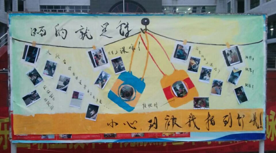 宣传部同学分为三组,将展板曝光活动分三部曲进行。第一曲“望者莫行”,弹出了校园内操场、教室、寝室、走廊等地方的垃圾;接着用“晒的就是你”一曲奏出上课睡觉、打游戏,公共场所抽烟、谈恋爱、穿拖鞋等不文明现象;最后一曲“你想成为谁”,激进的演绎出不文明现象和文明现象,引发同学们的深思。每一曲都引起同学们的轰动,让同学们无形之中自己约束自己不文明的行为,同时也监督身边的人。
