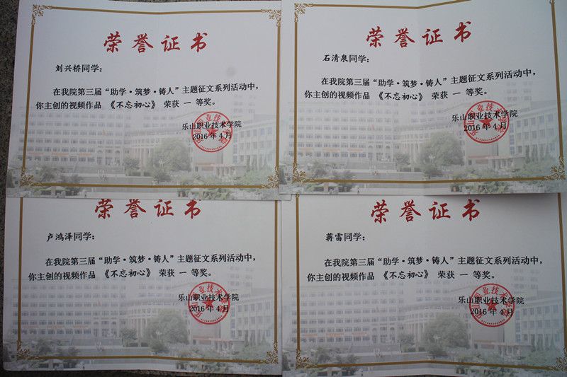 同学们的征文和视频都以自己的真实经历,表达出国家助学政策点亮他们的梦想照亮前行的路。最终,我系视频作品《不忘初心》获得学院一等奖。征文活动中由我系动漫15-1班陈星橙以《想到这些,我便不敢松懈》为题目获得学院一等奖,动漫15-1班李娅和刘涛获得佳绩,并被学院推荐到省上参加比赛。在此希望我系同学以后能够相互传递正能量,增强社会责任,向更高的目标发展,成为社会的栋梁之才。