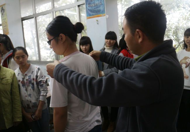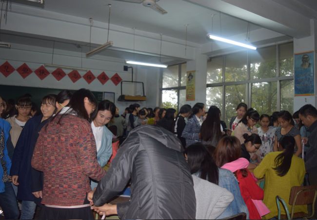 由于旅游系专业需要正式的职业套装,11月11日,旅游系大一旅游一、二班、导游班、酒店班四个班的一百余名同学于下午一点,在酒店一班教室集体参加了量身定做职业套装的工作。