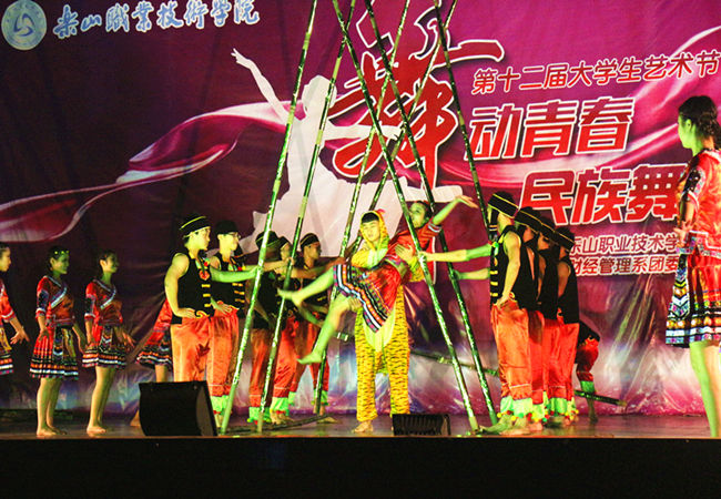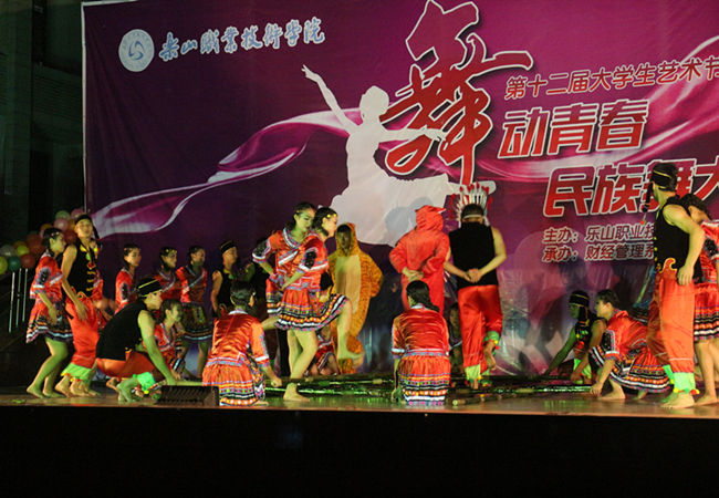 为丰富大学生的课余生活,弘扬中华文化 。由财经系承办的学院于2015年11月25日晚七点在新村校区举办了第十二届大学生艺术节---“舞动青春”民族舞大赛。这次活动很荣幸的邀请到以下重量级评委。他们是国家级一级舞蹈编导、乐山市舞蹈家协会主席熊永辉,舞蹈家协会会员、乐山市舞协副秘书长王妮女士,四川省舞蹈家协会会员、乐山市舞协理事刘华岭女士。到场的还有学院学工部部长、团委书记叶宏光,学院学工部副部长,团委副书记魏凡、罗建玮,旅游系党总支书记:李忠东,旅游系副主任黄剑波,以及各系部领导、老师和学生前来观看比赛。